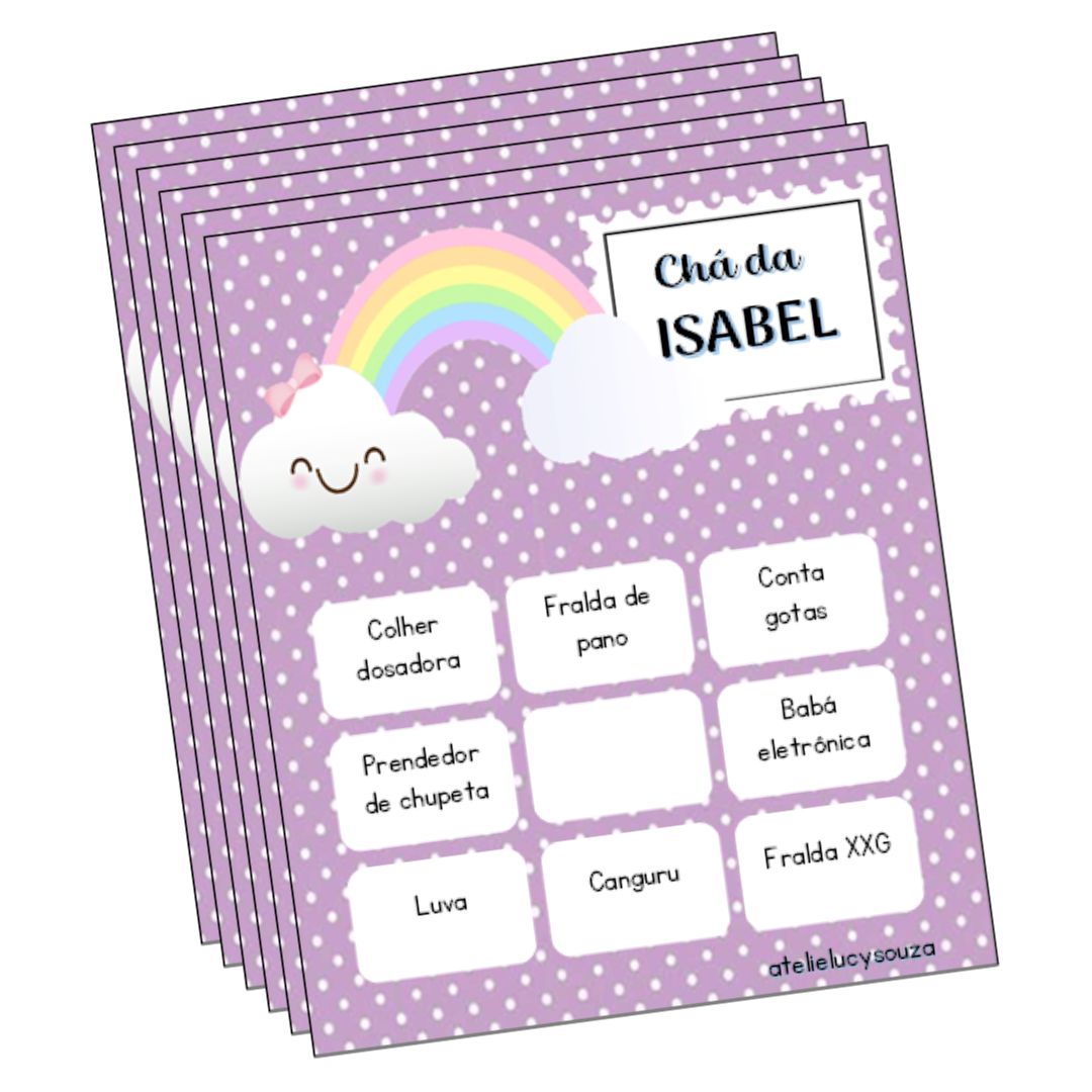 Lista de enxoval padronizada com base nos itens mais usados. VOCÊ SÓ PODERÁ ALTERAR O TÍTULO DAS CARTELAS. As cores, arte e temas são os disponíveis no anúncio para escolha.